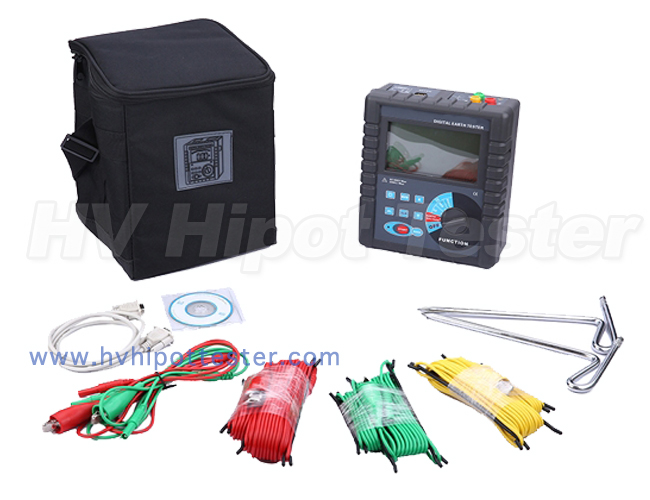 HV3000 Digital Earth Resistance Tester is composed of host machine, monitoring software, testing wires, communication wires and others. The large LCD display of host machine is with blue backlight and bar graph indicating that can be seen clearly. At the same time it can store 400 sets of data, fulfilling historical inquiry and online real-time monitoring through monitoring software, dynamic display, with the maximum, minimum, and mean indicators, with alarm settings and alarm indicator, and with the functions like historical data access, reading, preservation, report forms, printing and so on.